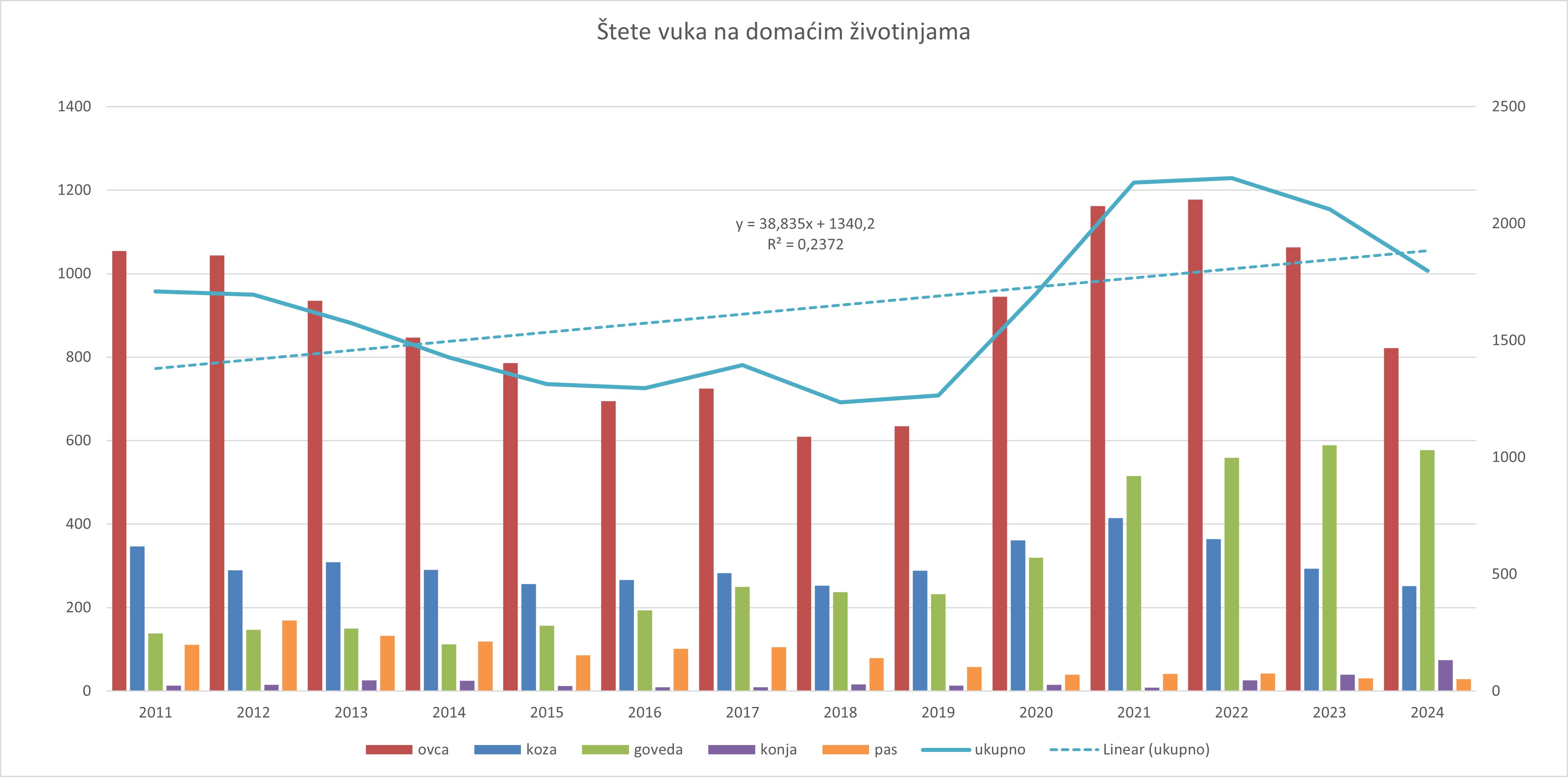 Od 2015. godine bilježi se godišnji porast zahtjeva za naknadu štete na stoci. Zahtjevi za naknadu štete od pasa smanjili su se od 2018., dok su zahtjevi za naknadu štete od koza i ovaca smanjeni od 2021.