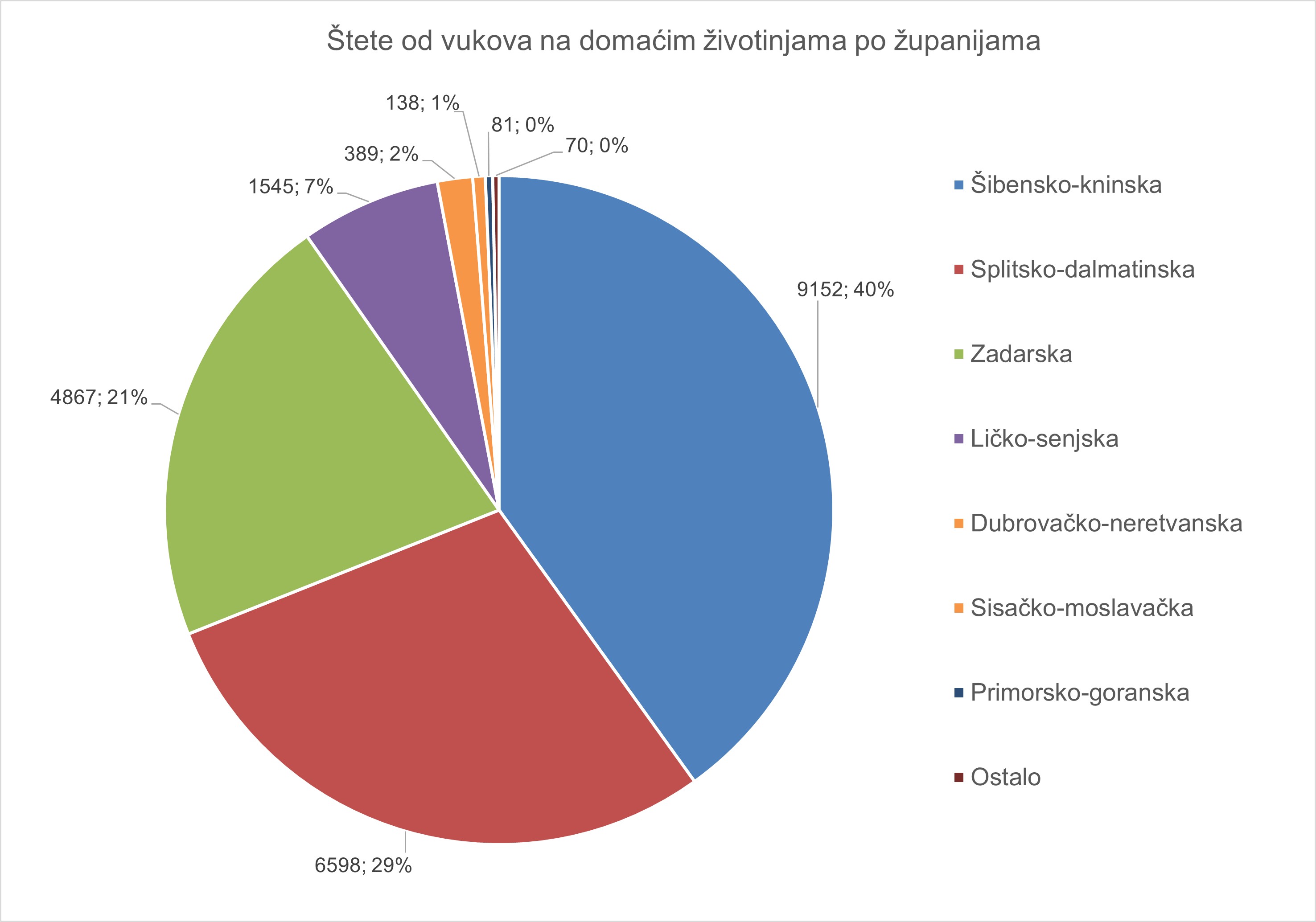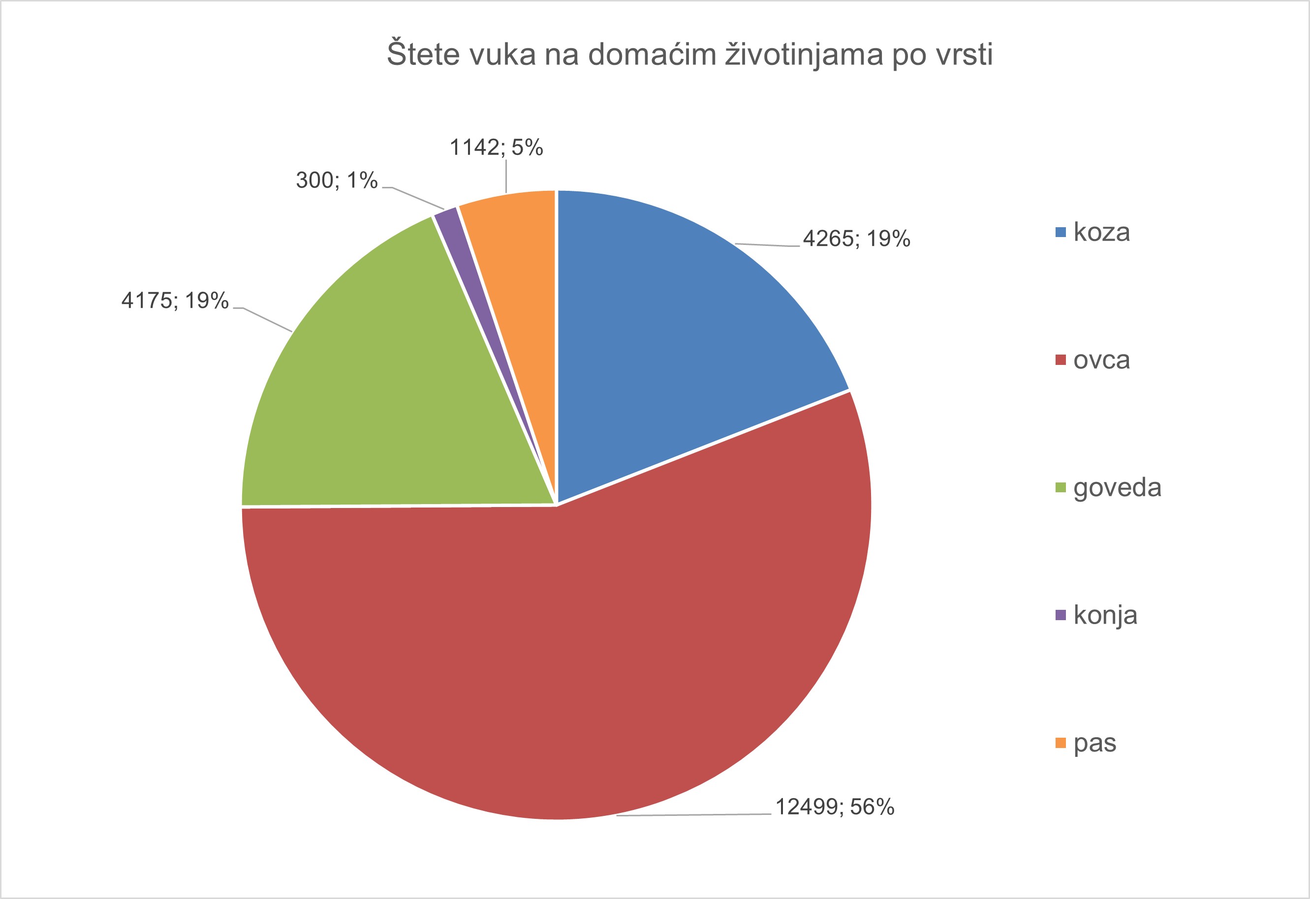 Ovce su vrsta stoke s najvećim brojem zahtjeva za naknadu štete, s udjelom od 56% (n = 12 499) od ukupnog broja zahtjeva, a slijede koze i goveda s 19% (n = 4 265 i n = 4 175). Psi čine oko 5% (n = 1 142), a konji 2% (n = 300), što su najniži postoci zahtjeva za naknadu štete.